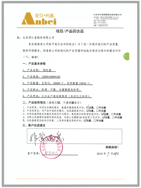 安貝為北京同仁堂藥業(yè)立體庫項(xiàng)目的30000個(gè)貨位配套了鋼托盤產(chǎn)品,得到了北京同仁堂領(lǐng)導(dǎo)的高度評價(jià)
