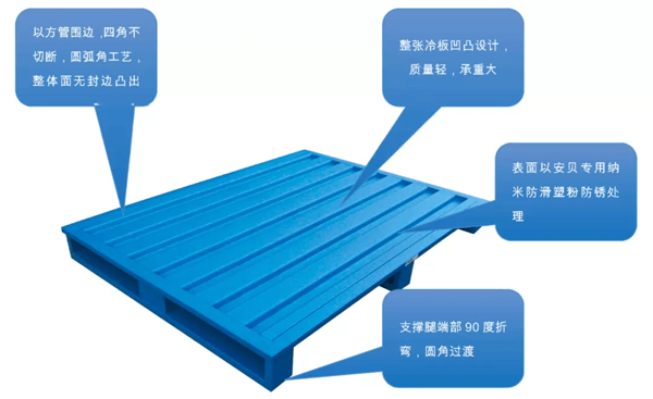 通過生產(chǎn)環(huán)節(jié)對鋼托盤表面處理工藝,有效的對鋼托盤進(jìn)行了防滑處理,真正解決了大量空托盤在自動化立體庫輸送中,因表面光滑導(dǎo)致空盤碼垛運(yùn)行的錯(cuò)位問題。