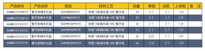 四向三腿——整平面鋼木托盤 技術參數(shù)說明: 產(chǎn)品編號:AAHMD4ⅢY1512170 產(chǎn)品規(guī)格: 1500*1200*170 防銹工藝: 靜電銀粉沙紋噴塑 產(chǎn)品靜載: 2000KG(均勻載重) 產(chǎn)品動載: 2000KG(均勻載重) 產(chǎn)品上架: 1500KG(均勻載重) 主要用途: 倉庫、車間周轉(zhuǎn)、高庫物流及倉儲